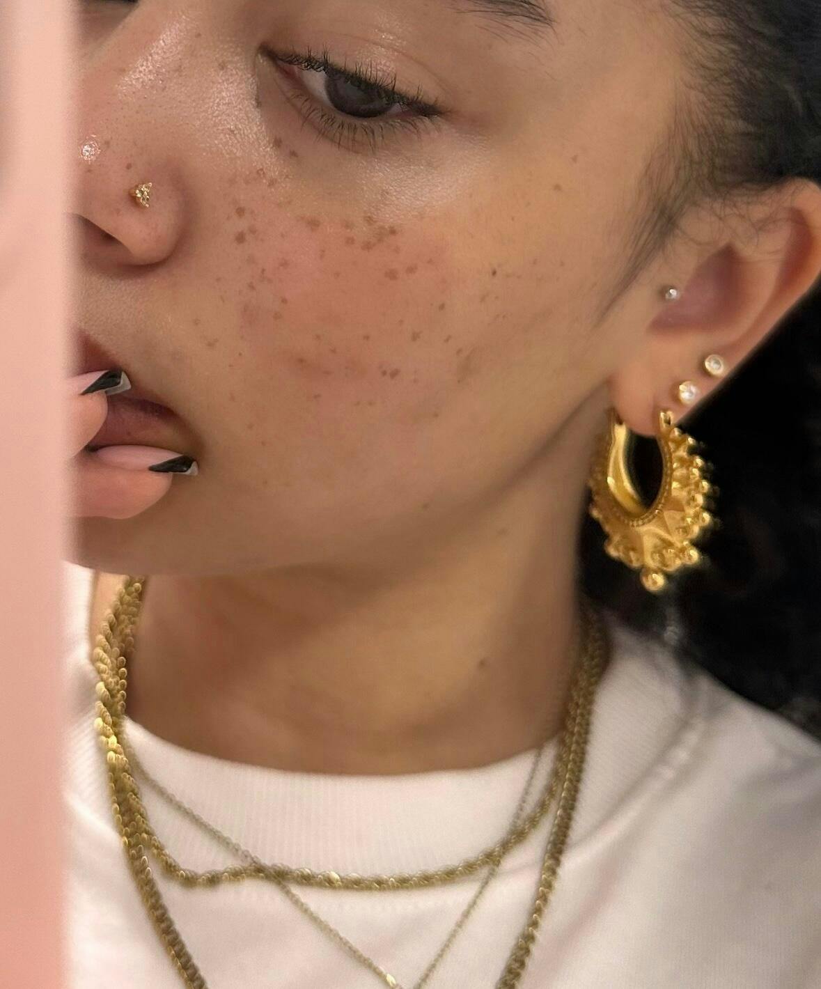 These hoop earrings are 18kt gold plated Stainless Steel with a PVD vacuum coating which means they're 100% waterproof, tarnish free and won’t ever turn your skin green.