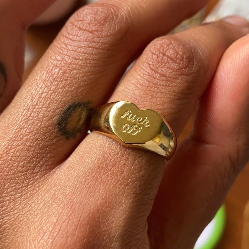This ring is 18kt gold plated stainless steel and is waterproof and tarnish free.